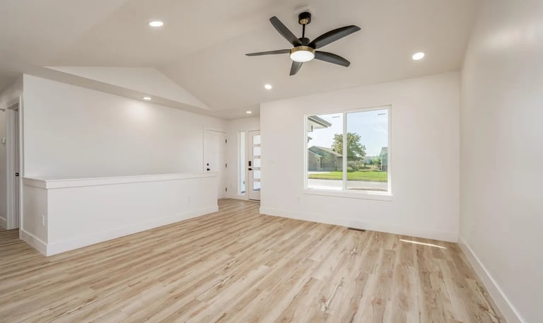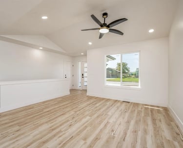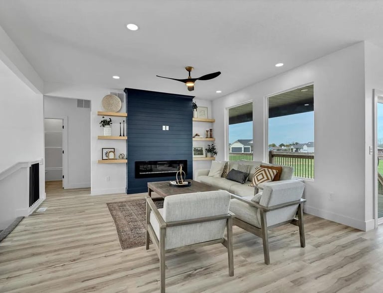 A warm, inviting living room featuring custom woodwork, soft lighting, and a stone fireplace that creates a perfect family gathering spot.
